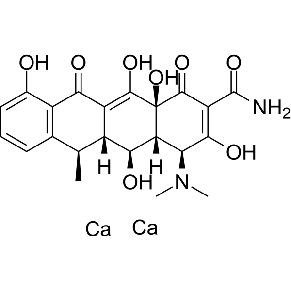 - 抗肿瘤:抑制线粒体功能,减少癌症干细胞的自我更新,并下调MMPs,从而抑制肿瘤生长和转移[1,5] - 基因调控:作为TetR的配体,诱导或抑制Tet诱导系统中的基因表达(例如,调节大脑中的GDNF表达)[6,7] - 临床疗效: - 幽门螺杆菌根除:与阿莫西林和质子泵抑制剂(PPI)联合使用,以多西环素为基础的三联疗法可达到80-85%的根除率(优于克拉霉素耐药菌株的克拉霉素疗法)[8] - 癌症治疗:多西环素(50 mg/kg/天)可增强 MEK 抑制剂在 KRAS 突变型肺癌中的疗效,且不增加毒性[1] - 研究应用:- 用于 Tet 诱导型转基因小鼠模型,以实现组织特异性和时间依赖性基因表达控制[7] 根据州或联邦政府的标签要求,多西环素钙(内服)可能引起发育毒性。 多西环素是一种处方抗菌药物,经美国食品药品监督管理局 (FDA) 批准用于治疗某些感染。此外,多西环素还经 FDA 批准用于预防由恶性疟原虫引起的疟疾。 多西环素获 FDA 批准用于治疗的许多感染可能是 HIV 的机会性感染 (OI)。 多西环素钙是具有抗菌活性的多西环素钙盐形式。多西环素可阻断氨酰tRNA与mRNA-核糖体复合物的结合,从而抑制蛋白质合成。此外,该药物还表现出对胶原酶活性的抑制作用。(NCI) 一种具有类似抗菌活性的合成四环素衍生物。 另见:多西环素钙(注释已移至)。 |