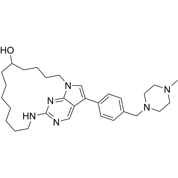 携带MV4-11 AML异种移植瘤的裸鼠:口服Dubermatinib(20 mg/kg/天)持续28天,肿瘤生长抑制率(TGI)达82%;中位生存期从溶剂组26天延长至55天[2] - 携带MDA-MB-231乳腺癌肺转移的小鼠:口服Dubermatinib(15 mg/kg/天)持续35天,肺转移结节较溶剂组减少78%;免疫组化显示肿瘤中p-Axl降低85%[2] |