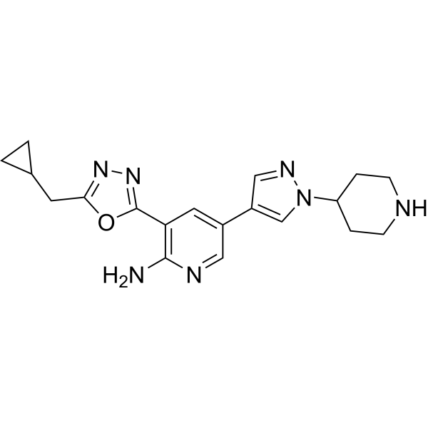 2-((5-氯-2-((4-((4-甲基哌嗪-1-基)甲基)苯基)氨基)嘧啶-4-基)氨基)-N,N-二甲基苯磺酰胺已在狭叶龙血树(Dracaena angustifolia)中被发现,并有相关数据报道。 杜伯马替尼是一种口服的选择性受体酪氨酸激酶AXL(UFO)抑制剂,具有潜在的抗肿瘤活性。给药后,杜伯马替尼靶向并结合AXL,抑制其活性。这阻断了AXL介导的信号转导通路,抑制了上皮-间质转化(EMT),进而抑制肿瘤细胞的增殖和迁移。此外,TP-0903 可增强对某些其他化疗药物的化疗敏感性。AXL 是 Tyro3、AXL 和 Mer (TAM) 受体酪氨酸激酶家族的成员,在许多肿瘤细胞类型中过度表达,在肿瘤细胞增殖、存活、侵袭和转移中起着关键作用;其表达与耐药性和不良预后相关。 杜伯马替尼 (TP-0903)是一种泛TAM家族(Axl/Mer/Tyro3)酪氨酸激酶抑制剂,已开发用于治疗TAM依赖性血液系统恶性肿瘤(急性髓系白血病、慢性髓系白血病)和实体瘤(非小细胞肺癌、乳腺癌)[1][2] - 其抗肿瘤机制涉及Axl和Mer的双重抑制,阻断下游PI3K-AKT/MEK-ERK信号通路,抑制细胞增殖,诱导细胞凋亡,并减少转移[2] - 临床前数据支持其治疗TAM过表达癌症的潜力,特别是那些对传统化疗耐药的癌症[2] |