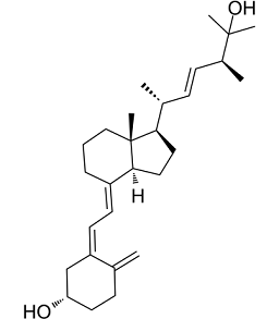 9,10-麦角甾-5,7,10(19),22-四烯-3,25-二醇是维生素D2的生物活性代谢产物,其治疗佝偻病的活性高于其母体化合物。该化合物被认为与维生素D2和25-羟基维生素D3结合于同一受体。 |