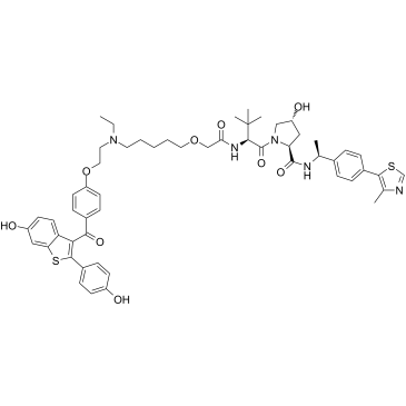InChI=1S/C55H65N5O9S2/c1-7-59(26-28-69-43-22-17-37(18-23-43)49(65)48-44-24-21-41(62)30-46(44)71-51(48)39-15-19-40(61)20-16-39)25-9-8-10-27-68-32-47(64)58-52(55(4,5)6)54(67)60-31-42(63)29-45(60)53(66)57-34(2)36-11-13-38(14-12-36)50-35(3)56-33-70-50/h11-24,30,33-34,42,45,52,61-63H,7-10,25-29,31-32H2,1-6H3,(H,57,66)(H,58,64)/t34-,42+,45-,52+/m0/s1