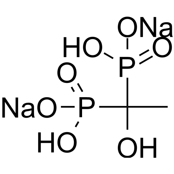 Etidronate (10 mM, 24 h) disodium 具有细胞毒性,导致 MCF-7 细胞中 p53 的改变以及 S 期细胞群的减少和 G2/M 细胞群的增加 [3]。破骨细胞凋亡由依替膦酸二钠(100 nM,24 小时)诱导,通过荧光显微镜分析可见细胞和核形态以及染色质浓缩的改变 [5]。