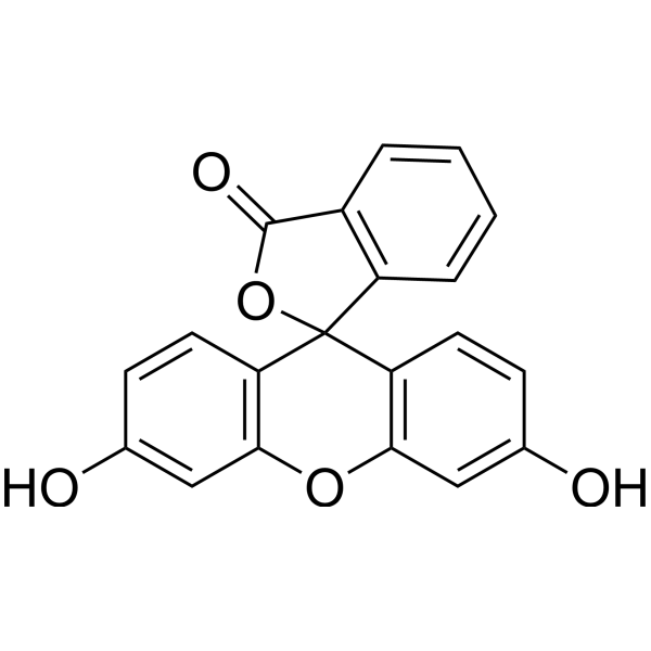 - 过氧化物酶模拟活性:荧光素(Fluorescein)具有过氧化物酶样催化活性,在过氧化氢(H₂O₂)存在下可催化3,3',5,5'-四甲基联苯胺(TMB)氧化,生成蓝色氧化产物。该催化反应遵循米氏动力学,对TMB的Km值为0.21 mM,对H₂O₂的Km值为1.85 mM,Vmax为5.76×10⁻⁸ M·s⁻¹。催化活性的最适pH为4.0,在40°C下孵育1小时后,活性仍保持最大值的80% [3] - 抗菌活性:荧光素(Fluorescein)单独使用时对革兰氏阳性菌(金黄色葡萄球菌、枯草芽孢杆菌)和革兰氏阴性菌(大肠杆菌、铜绿假单胞菌)表现出较弱的抗菌活性,在100 μg/mL浓度下,抑菌圈直径范围为6.2-7.5 mm。相比之下,其与金属氧化物形成的纳米杂化物抗菌效力显著增强 [1] |