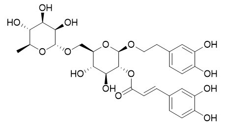 连翘苷H(化合物1)是一种新的咖啡酰苯乙醇苷(CPG),从连翘(Forsythia suspense (Thunb.) Vahl)的果实中分离得到。利用光谱学方法(IR、ESIMS、HRESIMS、1D和2D NMR)和化学分析(酸水解)确定其结构为2-(3,4-二羟基苯基)-乙基-O-α-L-鼠李糖基-(1→6)-2-O-反式-咖啡酰-β-D-吡喃葡萄糖苷。它是已知化合物连翘苷A的位置异构体,区别在于咖啡酰酯单元与吡喃葡萄糖基部分的连接位置。 [1] 连翘(Forsythia suspense)的果实(中医称之为“连翘”)用于治疗炎症、发热、溃疡、淋病和丹毒。[1] |