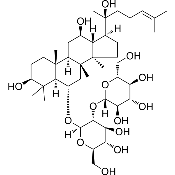 人参皂苷Rf已在人参、绞股蓝以及其他有相关数据的生物体中被报道。 另见:亚洲人参(部分)。 - 来源和背景:人参皂苷Rf是一种痕量三萜皂苷,从人参(五加科)的根中分离得到。人参是一种传统药用植物,用于增强活力和缓解疲劳[1][2]。 - 机制概述: - 抑制Ca²⁺通道:人参皂苷Rf通过百日咳毒素敏感的G蛋白选择性地抑制交感神经元中的电压门控Ca²⁺通道,该G蛋白可能参与调节神经递质的释放[1]。 - 镇痛作用:人参皂苷Rf具有镇痛作用。小鼠通过非阿片类途径(纳洛酮不敏感)产生阿片类药物,但具体的分子靶点(例如,非阿片受体)尚未确定[2] |