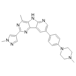 InChI=1S/C25H26N8/c1-16-22-23(30-24(28-16)19-14-27-32(3)15-19)21-12-18(13-26-25(21)29-22)17-4-6-20(7-5-17)33-10-8-31(2)9-11-33/h4-7,12-15H,8-11H2,1-3H3,(H,26,29)