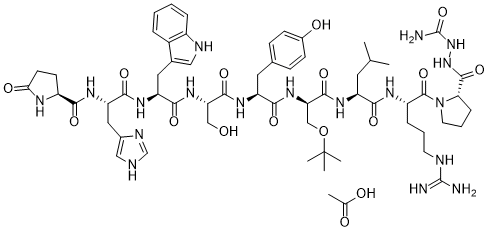 戈舍瑞林醋酸盐是促黄体生成素释放激素 (LHRH) 合成十肽类似物的醋酸盐。男性长期持续服用戈舍瑞林会导致垂体促性腺激素分泌受到抑制,从而导致睾酮生成显著下降;女性长期服用会导致雌二醇生成减少。(NCI04) 戈舍瑞林是一种合成的长效促性腺激素释放激素激动剂。它用于治疗前列腺恶性肿瘤、子宫肌瘤和转移性乳腺癌。 另见:戈舍瑞林(含有活性部分)。 |