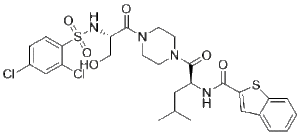 CC(C)C[C@@H](C(=O)N1CCN(CC1)C(=O)[C@H](CO)NS(=O)(=O)C2=C(C=C(C=C2)Cl)Cl)NC(=O)C3=CC4=CC=CC=C4S3