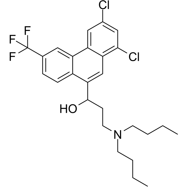 卤泛群的 IC50 为 196.9 nM,抑制复极后产生的 HERG 尾电流从 +30 mV 至 760 mV [2]。卤泛群的 IC50 为 7.73±0.23 μM,可抑制 MDA-MB-231 三阴性乳腺癌 (TNBC) 细胞的生长[3]。卤泛群的 IC50 分别为 0.0011、0.0012 和 6.70 μM,对成年配子细胞 IV-V、无性形式 (3D7A) 和无性形式 (3D7HT-GFP) 具有作用 [4]。