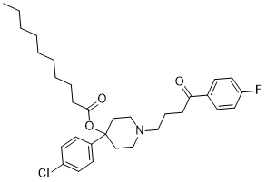 癸酸氟哌啶醇是氟哌啶醇的癸酸酯,氟哌啶醇是一种苯丁基哌啶衍生物,具有抗精神病、抗神经阻滞和止吐作用。氟哌啶醇竞争性阻断大脑中脑边缘系统的突触后多巴胺(D2)受体,从而产生抗妄想和抗幻觉作用。其止吐活性源于通过化学感受触发区(CTZ)的D2多巴胺受体介导的拮抗作用。 另见:氟哌啶醇(含有活性部分)。 |