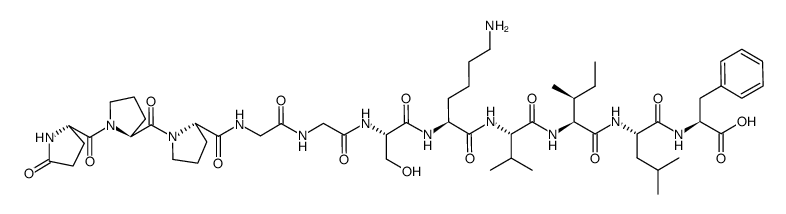 InChI=1S/C54H84N12O14/c1-7-32(6)45(51(76)61-36(25-30(2)3)47(72)62-37(54(79)80)26-33-15-9-8-10-16-33)64-50(75)44(31(4)5)63-46(71)34(17-11-12-22-55)60-48(73)38(29-67)59-43(70)28-56-42(69)27-57-49(74)39-18-13-23-65(39)53(78)40-19-14-24-66(40)52(77)35-20-21-41(68)58-35/h8-10,15-16,30-32,34-40,44-45,67H,7,11-14,17-29,55H2,1-6H3,(H,56,69)(H,57,74)(H,58,68)(H,59,70)(H,60,73)(H,61,76)(H,62,72)(H,63,71)(H,64,75)(H,79,80)/t32-,34-,35-,36-,37-,38-,39-,40-,44-,45-/m0/s1