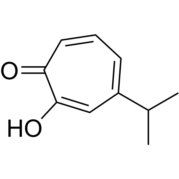 据报道,在侧柏(Thujopsis dolabrata)、台湾扁柏(Chamaecyparis formosensis)和其他有相关数据的生物体中均发现了桧木醇。 - 桧木醇(β-侧柏素)是一种从柏科植物心材中分离得到的天然单萜酚,具有已知的抗氧化和抗菌活性[1, 2]。 - 在胶质瘤干细胞中,桧木醇通过下调Nrf2通路抑制癌症干性和致癌性。Nrf2通路在胶质瘤干细胞中过度激活,促进干性维持和肿瘤发生[1]。 - 在结肠癌细胞中,桧木醇通过抑制DNMT1(一种关键的DNA甲基转移酶)和UHRF1(一种调节因子)诱导DNA去甲基化。 DNMT1 的募集),这可能重新激活因过度甲基化而沉默的抑癌基因[2] |