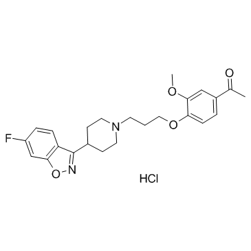 Iloperidone HCl; Iloperidone hydrochloride; 1299470-39-5; Iloperidone (hydrochloride); Iloperidone HCl; HP 873 hydrochloride; Ethanone, 1-[4-[3-[4-(6-fluoro-1,2-benzisoxazol-3-yl)-1-piperidinyl]propoxy]-3-methoxyphenyl]-, hydrochloride (1:1); 1-[4-[3-[4-(6-fluoro-1,2-benzoxazol-3-yl)piperidin-1-yl]propoxy]-3-methoxyphenyl]ethanone;hydrochloride; 1-[4-[3-[4-(6-Fluoro-1,2-benzoxazol-3-yl)piperidin-1-yl]propoxy]-3-methoxyphenyl]ethanone Hydrochloride;