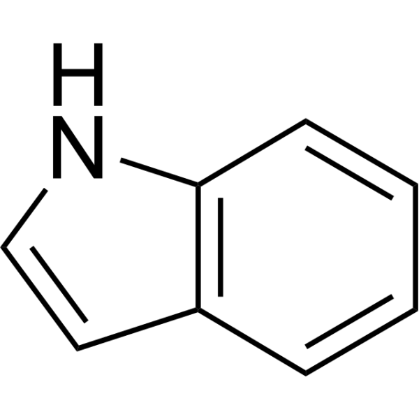 吲哚是大肠杆菌(K12菌株、MG1655菌株)中发现或产生的代谢产物。 据报道,在Tetrastigma hemsleyanum、Daphne odora和其他一些有相关数据的生物体中也发现了吲哚。 作用机制 本研究在小鼠中探讨了杂环化合物对肝脏外源性物质代谢酶的影响。雌性CD-1小鼠分别灌胃给予5 μmol/kg香豆素、三亚甲基氧化物(TMO)或三亚甲基硫醚(TMS),持续6天;或每日灌胃给予苯并呋喃、吲哚或吲哚-3-甲醇(IC),持续10天。动物在末次给药后1或2天处死;取出肝脏并检测环氧化物水解酶、谷胱甘肽-S-转移酶 (GST)、还原型NADH-醌还原酶 (NADH/QR)、葡萄糖-6-磷酸脱氢酶 (G6PDH)、谷胱甘肽还原酶 (GSSG-red)、尿苷二磷酸葡萄糖脱氢酶 (UDPGDH)、苯胺羟化酶、7-乙氧基香豆素脱乙基酶 (ECOD)、细胞色素c还原酶 (cyt-c-red) 和细胞色素P450的活性。除吲哚外,所有化合物均显著增强了环氧化物水解酶活性。除TMO和TMS外,所有化合物均提高了GST活性。NADH/QR活性仅被香豆素和苯并呋喃提高。吲哚仅增强了谷胱甘肽S-转移酶(GST)、尿苷二磷酸葡萄糖脱氢酶(UDPGDH)和细胞色素c还原酶的活性。IC增强了GST、UDPGDH、细胞色素c还原酶、环氧化物水解酶和细胞色素P450及其相关单加氧酶的活性。苯并呋喃和香豆素的反应更为多样。两种化合物均增强了环氧化物水解酶、GST和NADH/QR的活性。苯并呋喃降低了细胞色素P450的含量,并提高了环氧合酶(ECOD)的活性。 |
