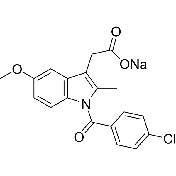 在雄性 Sprague-Dawley 大鼠中,吲哚美辛钠(0.01–10 mg/kg;口服;3 小时)会引起痛觉过敏和爪水肿,并以剂量依赖性方式逆转角叉菜胶诱导的痛觉过敏 [1]。吲哚美辛钠(10 mg/mL)在体内可抑制肿瘤生长;口服;每天一次,持续 29 天;雄性 C57BL/6J 小鼠)[2]。