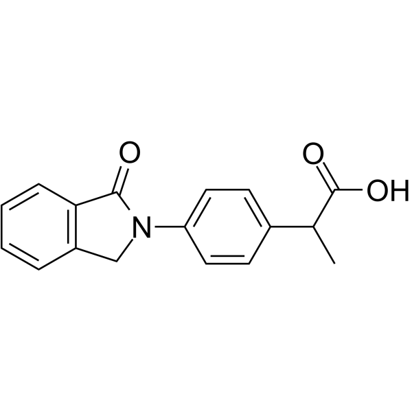 吲哚洛芬是一种单羧酸,其结构为丙酸,其中2位上的一个氢原子被4-(1-氧代-1,3-二氢异吲哚-2-基)苯基取代。最初用作抗炎镇痛药,但由于引起严重的胃肠道出血而被撤市。随后发现它能增加运动神经元存活蛋白的产生。它是一种非甾体类抗炎药、非麻醉性镇痛药和EC 1.14.99.1(前列腺素内过氧化物合酶)抑制剂。它是一种单羧酸,属于异吲哚类化合物和γ-内酰胺类化合物。其功能与丙酸相关。