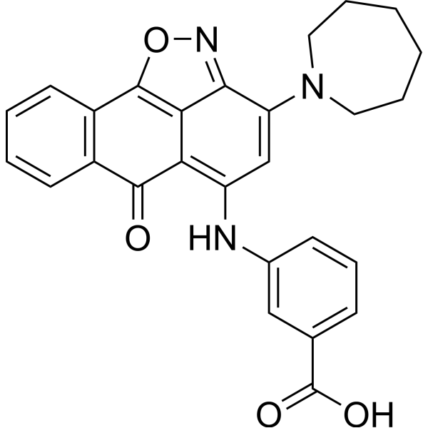 InChI=1S/C27H23N3O4/c31-25-18-10-3-4-11-19(18)26-23-22(25)20(28-17-9-7-8-16(14-17)27(32)33)15-21(24(23)29-34-26)30-12-5-1-2-6-13-30/h3-4,7-11,14-15,28H,1-2,5-6,12-13H2,(H,32,33)