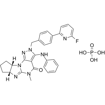 CN1C(=O)C2=C(N(N=C2N3C1=N[C@H]4[C@@H]3CCC4)CC5=CC=C(C=C5)C6=NC(=CC=C6)F)NC7=CC=CC=C7.OP(=O)(O)O
