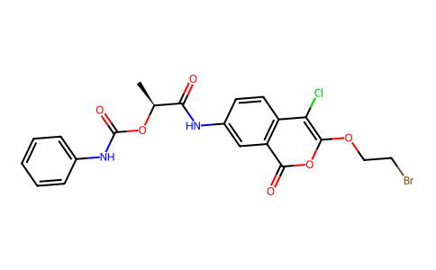 C[C@@H](C(=O)NC1=CC2=C(C=C1)C(=C(OC2=O)OCCBr)Cl)OC(=O)NC3=CC=CC=C3