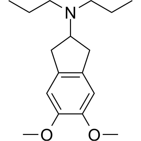 5,6-Dimethoxy-N,N-dipropyl-2,3-dihydro-1H-indene-2-amine is an indene compound. Many G protein-coupled receptors have been shown to be sensitive to sodium ions (Na+). We used a radioligand competition binding assay to detect and compare the effects of sodium ions on the binding affinity of various structurally different ligands to human dopamine D2 and dopamine D3 receptor subtypes. These two receptors are important targets for the treatment of mental illnesses. On both receptors, the antagonists/inverse agonists SB-277011-A, L,741,626, GR 103691, and U 99194 showed higher binding affinity in the presence of sodium ions compared to using the organic cation N-methyl-D-glucosamine (to control ionic strength). Conversely, the affinity of spiroperone and (+)-butyrmol was not affected by sodium ions. Interestingly, the binding of the antagonist/inverse agonist clozapine was affected by the variation in the ionic strength of the buffer solution used, rather than the presence of a specific cation. The two receptors showed similar sensitivity to sodium ions, suggesting that sodium ion interactions have a similar effect on receptor conformation. However, no significant association was observed between ligand properties (e.g., subtype selectivity) and sodium ion sensitivity. Therefore, the nature determining this sensitivity remains unclear. Nevertheless, these findings do highlight the importance of careful consideration of the composition of the detection buffer in in vitro experiments and when comparing different study data, and may suggest the need for further control over ligand binding in vivo. [2]