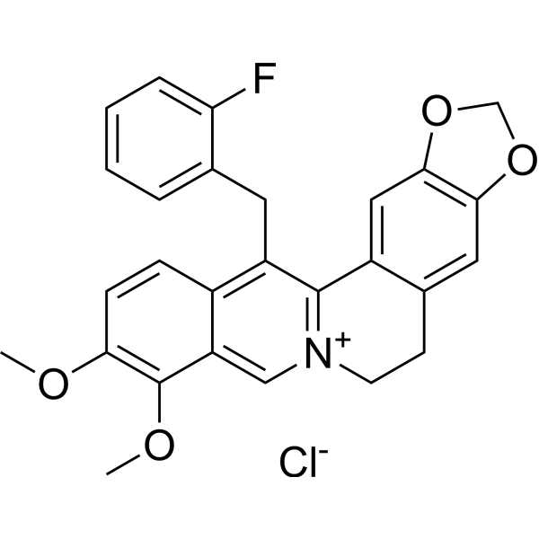 InChI=1S/C27H23FNO4.ClH/c1-30-23-8-7-18-20(11-17-5-3-4-6-22(17)28)26-19-13-25-24(32-15-33-25)12-16(19)9-10-29(26)14-21(18)27(23)31-2;/h3-8,12-14H,9-11,15H2,1-2H3;1H/q+1;/p-1