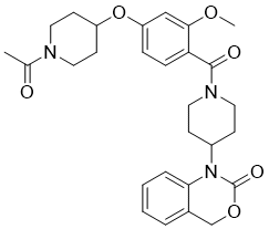 CC(=O)N1CCC(CC1)OC2=CC(=C(C=C2)C(=O)N3CCC(CC3)N4C5=CC=CC=C5COC4=O)OC