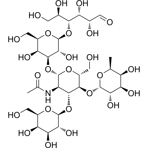 C[C@H]1[C@H]([C@H]([C@@H]([C@@H](O1)O[C@@H]2[C@H](O[C@H]([C@@H]([C@H]2O[C@H]3[C@@H]([C@H]([C@H]([C@H](O3)CO)O)O)O)NC(=O)C)O[C@H]4[C@H]([C@H](O[C@H]([C@@H]4O)O[C@H]([C@@H](CO)O)[C@@H]([C@H](C=O)O)O)CO)O)CO)O)O)O