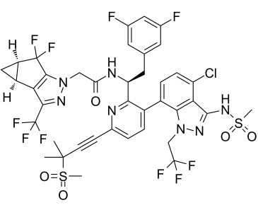 N-((S)-1-(3-(4-chloro-3-(methylsulfonamido)-1-(2,2,2-trifluoroethyl)-1H-indazol-7-yl)-6-(3-methyl-3-(methylsulfonyl)but-1-yn-1-yl)pyridin-2-yl)-2-(3,5-difluorophenyl)ethyl)-2-((3bS,4aR)-5,5-difluoro-3-(trifluoromethyl)-3b,4,4a,5-tetrahydro-1H-cyclopropa[3,4]cyclopenta[1,2-c]pyrazol-1-yl)acetamide