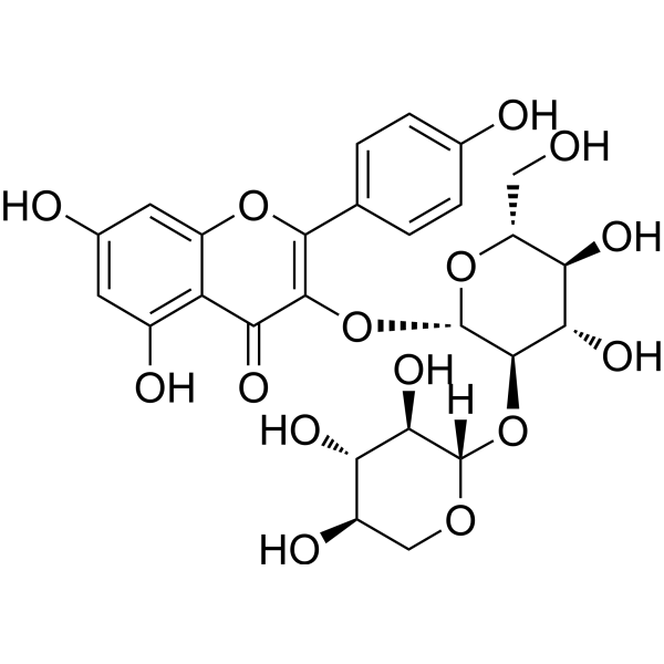 Leucoside; 27661-51-4; 3-((2S,5S)-4,5-dihydroxy-6-(hydroxymethyl)-3-((2S,3R,5R)-3,4,5-trihydroxyoxan-2-yl)oxyoxan-2-yl)oxy-5,7-dihydroxy-2-(4-hydroxyphenyl)chromen-4-one; 3-[(2S,3R,4S,5S,6R)-4,5-dihydroxy-6-(hydroxymethyl)-3-[(2S,3R,4S,5R)-3,4,5-trihydroxyoxan-2-yl]oxyoxan-2-yl]oxy-5,7-dihydroxy-2-(4-hydroxyphenyl)chromen-4-one; 3-(((2S,3R,4S,5S,6R)-4,5-Dihydroxy-6-(hydroxymethyl)-3-(((2S,3R,4S,5R)-3,4,5-trihydroxytetrahydro-2H-pyran-2-yl)oxy)tetrahydro-2H-pyran-2-yl)oxy)-5,7-dihydroxy-2-(4-hydroxyphenyl)-4H-chromen-4-one; Leucoside (Standard); Kaemoferol 5-Xyl(1,2)Glc; CHEMBL446574;