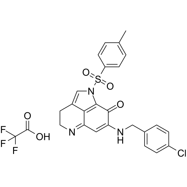 InChI=1S/C24H20ClN3O3S.C2HF3O2/c1-15-2-8-19(9-3-15)32(30,31)28-14-17-10-11-26-20-12-21(24(29)23(28)22(17)20)27-13-16-4-6-18(25)7-5-16;3-2(4,5)1(6)7/h2-9,12,14,27H,10-11,13H2,1H3;(H,6,7)