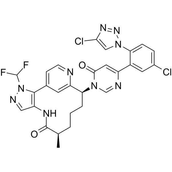 C[C@@H]1CCC[C@@H](C2=NC=CC(=C2)C3=C(C=NN3C(F)F)NC1=O)N4C=NC(=CC4=O)C5=C(C=CC(=C5)Cl)N6C=C(N=N6)Cl