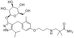 InChI=1S/C28H44N4O8/c1-15(2)21-19(25(32-31-21)40-26-24(36)23(35)22(34)20(13-33)39-26)12-17-7-8-18(11-16(17)3)38-10-6-9-30-14-28(4,5)27(29)37/h7-8,11,15,20,22-24,26,30,33-36H,6,9-10,12-14H2,1-5H3,(H2,29,37)(H,31,32)/t20-,22-,23+,24-,26+/m1/s1