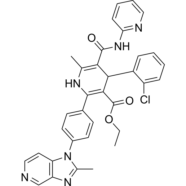 InChI=1S/C34H29ClN6O3/c1-4-44-34(43)31-30(24-9-5-6-10-25(24)35)29(33(42)40-28-11-7-8-17-37-28)20(2)38-32(31)22-12-14-23(15-13-22)41-21(3)39-26-19-36-18-16-27(26)41/h5-19,30,38H,4H2,1-3H3,(H,37,40,42)