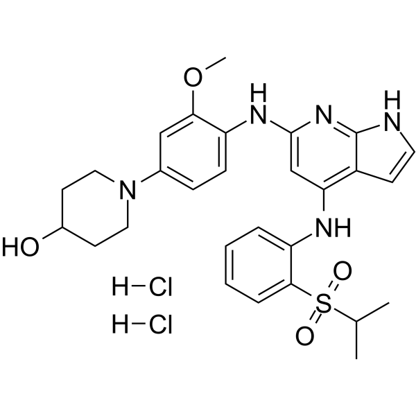 InChI=1S/C28H33N5O4S.2ClH/c1-18(2)38(35,36)26-7-5-4-6-23(26)30-24-17-27(32-28-21(24)10-13-29-28)31-22-9-8-19(16-25(22)37-3)33-14-11-20(34)12-15-33;;/h4-10,13,16-18,20,34H,11-12,14-15H2,1-3H3,(H3,29,30,31,32);2*1H