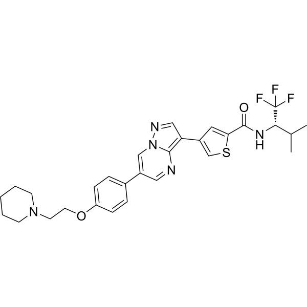 ULK1 是一种丝氨酸/苏氨酸蛋白激酶,是自噬早期阶段所必需的。 MRT68921 可防止细胞自噬并在体外抑制 ULK1 和 ULK2。 MRT68921 是 ULK1 和 ULK2 最有效的抑制剂,可将 ULK1 (2.9 nm) 和 ULK2 (1.1 nm) 的 IC50 分别降低 15 倍和 30 倍以上。该化合物抑制自噬的特殊能力是通过 ULK1 实现的。 ULK1 可能参与自噬体的成熟和启动,抑制 ULK1 后停滞的早期自噬体结构的积累就证明了这一点 [1]。