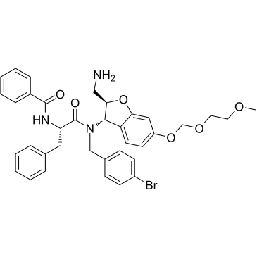 MSN-125; MSN 125; MSN-125; 1592908-16-1; CHEMBL5271207; N-((S)-1-(((2R,3S)-2-(Aminomethyl)-6-((2-methoxyethoxy)methoxy)-2,3-dihydrobenzofuran-3-yl)(4-bromobenzyl)amino)-1-oxo-3-phenylpropan-2-yl)benzamide; N-[(2S)-1-[[(2R,3S)-2-(aminomethyl)-6-(2-methoxyethoxymethoxy)-2,3-dihydro-1-benzofuran-3-yl]-[(4-bromophenyl)methyl]amino]-1-oxo-3-phenylpropan-2-yl]benzamide; BDBM50610530; MSN125.