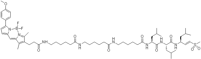 MV151; MV 151; 945611-88-1; (2S)-2-[6-[6-[6-[3-[2,2-difluoro-12-(4-methoxyphenyl)-4,6-dimethyl-3-aza-1-azonia-2-boranuidatricyclo[7.3.0.03,7]dodeca-1(12),4,6,8,10-pentaen-5-yl]propanoylamino]hexanoylamino]hexanoylamino]hexanoylamino]-4-methyl-N-[(2S)-4-methyl-1-[[(E,3S)-5-methyl-1-methylsulfonylhex-1-en-3-yl]amino]-1-oxopentan-2-yl]pentanamide; 6-(3-(5,5-difluoro-7-(4-methoxyphenyl)-1,3-dimethyl-5H-4l4,5l4-dipyrrolo[1,2-c:2',1'-f][1,3,2]diazaborinin-2-yl)propanamido)-N-((4S,7S,10S)-7,10-diisobutyl-2-methyl-4-((E)-2-(methylsulfonyl)vinyl)-6,9,12,19-tetraoxo-5,8,11,18-tetraazatetracosan-24-yl)hexanamide; MV-151; Bodipy TMRAhx(3)L(3)VS.