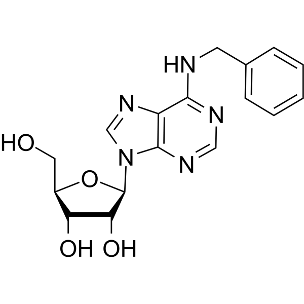 N6-苄基腺苷可抑制多种肿瘤细胞的克隆形成活性和增殖[2]。 T24 细胞中肌动蛋白细胞骨架的破坏和形态改变是由 N6-苄基腺苷引起的 [2]。 N6-苄基腺苷(10 μM;24 小时)可有效诱导细胞凋亡,是细胞凋亡系统的一员,具有不同的 caspase-3 和 caspase-9 活化作用 [3]。 N6-苄基腺苷(0-100 μM;24 小时)可诱导剂量依赖性染色质浓缩、凋亡体形成和 DNA 断裂成核小体片段 [3]。 N6-苄基腺苷是比人腺苷激酶更有效、更具选择性的抗弓形虫药物,与弓形虫腺苷激酶的结合亲和力高达 179.8 μM [4]。当应用于腺苷激酶 (TgAKS3) 缺陷的弓形虫菌株时,N6-苄基腺苷 (0-50 μM) 表现出轻微的抑制作用 [4]。化合物 2 (N6-苄基腺苷) (0.3–20 μM) 抑制法呢基焦磷酸合酶 (FPPS) 并干扰甲羟戊酸途径,从而提供抗神经胶质瘤作用 [5]。