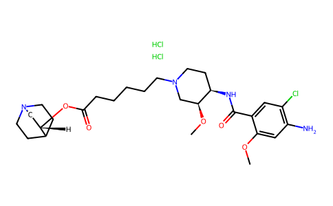 ClC1C(=CC(=C(C=1)C(N[C@@H]1CCN(CCCCCC(=O)O[C@H]2CN3CCC2CC3)C[C@@H]1OC)=O)OC)N.Cl.Cl