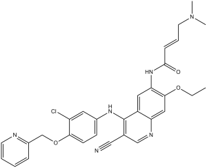 Neratinib (HKI-272; PB272; Nerlynx) potently inhibits HER2 (IC₅₀ = 59 nM) and EGFR (IC₅₀ = 92 nM) tyrosine kinases. It weakly inhibits KDR (IC₅₀ = 0.8 μM) and Src (IC₅₀ = 1.4 μM), and shows no significant inhibitory activity against Akt, CDK1/2/4, IKK-2, MK-2, PDK1, c-Raf, and c-Met [1] |