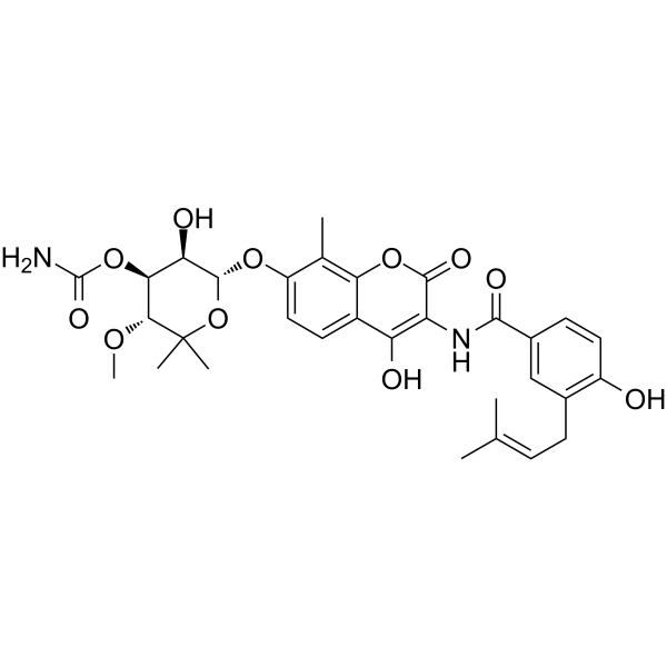 Novobiocin (1 mM) 通过竞争性抑制 ATP 与旋转酶 B 的结合来破坏核苷酸结合。它还会干扰辅助伴侣与 Hsp90(即 Hsc70 和 p23)的连接[1]。 Novobiocin(200 µM;24 小时)通过抑制顺式 DDP 和 BCNU 诱导的 DNA 链间交联的修复率来降低人多形性胶质母细胞瘤细胞的克隆存活率[2]。在依赖于 caspase-3/7 酶的 K562、HL60 和 Mutz-2 实验中,新生霉素(0.3 mM;48 小时)导致凋亡细胞增加约三到五倍[5]。