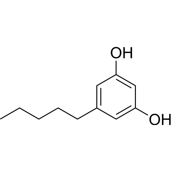 橄榄酚属于间苯二酚类化合物,是间苯二酚5位氢被戊基取代后的化合物。它是一种地衣代谢产物。 据报道,橄榄酚存在于紫金牛(Ardisia virens)、大麻(Cannabis sativa)和报春花(Primula obconica)中,并有相关数据。 - 橄榄酚(5-戊基间苯二酚)是一种天然酚类化合物,主要存在于大麻属植物中。它是THC和其他大麻素的关键生物合成前体[3] - 橄榄醇降低THC作用的机制涉及两条途径:(1) 与THC竞争结合CB₁/CB₂受体,从而降低THC介导的受体激活;(2) 抑制THC代谢为活性代谢物(例如11-羟基-THC),从而降低THC的全身生物活性[3] - 橄榄醇在减轻THC的不良反应方面具有潜在的临床应用价值,例如焦虑、精神运动障碍和认知功能障碍,这些不良反应在医用大麻或娱乐性THC暴露中很常见[3] |