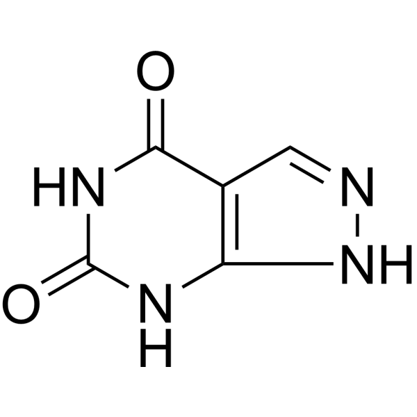 氧嘌呤醇是别嘌呤醇的代谢物,也是一种黄嘌呤氧化酶抑制剂。 据报道,氧嘌呤醇存在于紫海星(Asterias amurensis)、红贻贝(Mytilus coruscus)以及其他有相关数据的生物体中。 一种黄嘌呤氧化酶抑制剂。 药物适应症 用于治疗充血性心力衰竭和高尿酸血症。 作用机制 氧嘌呤醇抑制黄嘌呤氧化酶,阻断氧嘌呤的转化。次黄嘌呤和黄嘌呤可转化为尿酸。氧嘌呤浓度升高,并通过负反馈抑制黄嘌呤氧化酶,从而降低血液和尿液中尿酸的浓度。氧嘌呤醇还能促进次黄嘌呤和黄嘌呤掺入DNA和RNA中,进一步降低血清尿酸浓度。 |