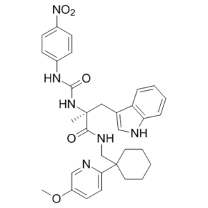C[C@](CC1=CNC2=CC=CC=C21)(C(=O)NCC3(CCCCC3)C4=NC=C(C=C4)OC)NC(=O)NC5=CC=C(C=C5)[N+](=O)[O-]