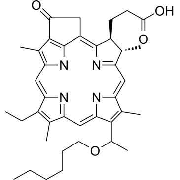 HPPH 是一种亲脂性第二代氯基光敏剂。静脉注射后,HPPH 可选择性地积聚在癌细胞或癌前细胞的细胞质中。当施加激光照射时,HPPH 与氧气之间会发生光动力反应,产生细胞毒性自由基和单线态氧,从而导致自由基介导的细胞死亡。与第一代光敏剂卟吩钠相比,HPPH 具有更优的药代动力学特性,且仅引起轻微的皮肤光敏反应,该反应在给药后数日内迅速消退。 |