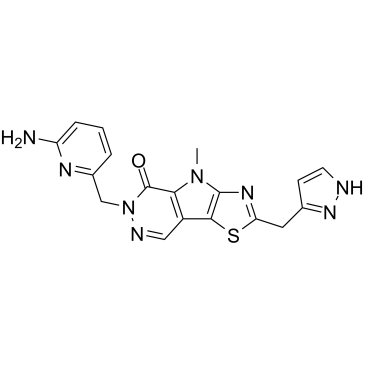 InChI=1S/C18H16N8OS/c1-25-15-12(16-17(25)23-14(28-16)7-10-5-6-20-24-10)8-21-26(18(15)27)9-11-3-2-4-13(19)22-11/h2-6,8H,7,9H2,1H3,(H2,19,22)(H,20,24)