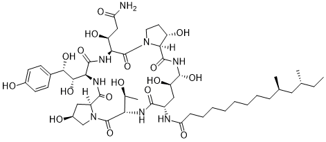 InChI=1S/C50H80N8O17/c1-5-25(2)20-26(3)12-10-8-6-7-9-11-13-37(66)52-31-22-35(64)46(71)56-48(73)41-33(62)18-19-57(41)50(75)39(34(63)23-36(51)65)54-47(72)40(43(68)42(67)28-14-16-29(60)17-15-28)55-45(70)32-21-30(61)24-58(32)49(74)38(27(4)59)53-44(31)69/h14-17,25-27,30-35,38-43,46,59-64,67-68,71H,5-13,18-24H2,1-4H3,(H2,51,65)(H,52,66)(H,53,69)(H,54,72)(H,55,70)(H,56,73)/t25-,26+,27+,30+,31-,32-,33-,34+,35+,38-,39-,40-,41-,42-,43-,46+/m0/s1