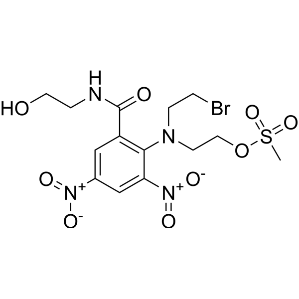 在有氧和缺氧环境下暴露 4 小时后,由 10 个人类癌细胞系组成的小组证明了 PR-104A (1-100 uM) 的抗增殖效力。 H460非小细胞肺癌细胞的IC50最低(0.51μM),而在这些细胞中也观察到最大的IC50(0.51μM)。 7.3 μM)在前列腺癌细胞 PC3 中[1]。醛酮还原酶 1C3 催化磷酸酯 PR-104 在体内快速转化为醇 PR-104A,这是一种氮芥前药,在缺氧细胞中代谢为羟胺 (PR-104H) 和胺 (PR-104M) DNA交联剂[3]。这个过程的发生与氧气无关。