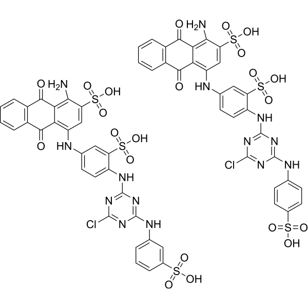 Reactive Blue 2 作为 ATP 受体拮抗剂,在 HeLa 细胞中产生 Ca2+ 振荡。 Reactive Blue 2 增强 Ca2+ 对与 PLC 级联相关的组胺的反应。 Reactive Blue 2 可能会激活 PLC 级联并以细胞外 Ca2+ 依赖性方式引起 Ca2+ 振荡 [1]。 Reactive Blue 2 的应用以剂量依赖性方式增强 K+ 分泌,这种上升的特点是达到峰值,然后部分松弛至稳定状态。 Reactive Blue 2 在 P2Y4 处具有拮抗活性,P2Y4 处的拮抗效力反映了 K+ 分泌的效力 [2]。蒽醌染料 Reactive Blue 2 被发现是从类囊体中分离和纯化的蛋白激酶的强抑制剂。该抑制方法是非竞争性的,膜结合激酶的 Ki 为 8 µM,纯酶的 Ki 为 6 µM。该抑制剂不会改变内源激酶的底物偏好,并且可以通过清洗从膜上去除[3]。 Reactive Blue 2 至少在有限的剂量范围内优先抑制通过 P2y 嘌呤能受体介导的过程。在用去甲肾上腺素增强张力的制剂中,ATP 和 2-甲硫基 ATP(但不是 α,β-亚甲基 ATP)会引起血管舒张。这些弛豫在活性蓝 2 存在的情况下被抑制[4]。 Reactive Blue 2 在 0.3-10 μM 剂量下以浓度依赖性方式抑制 ATP 诱导的振荡 [5]。