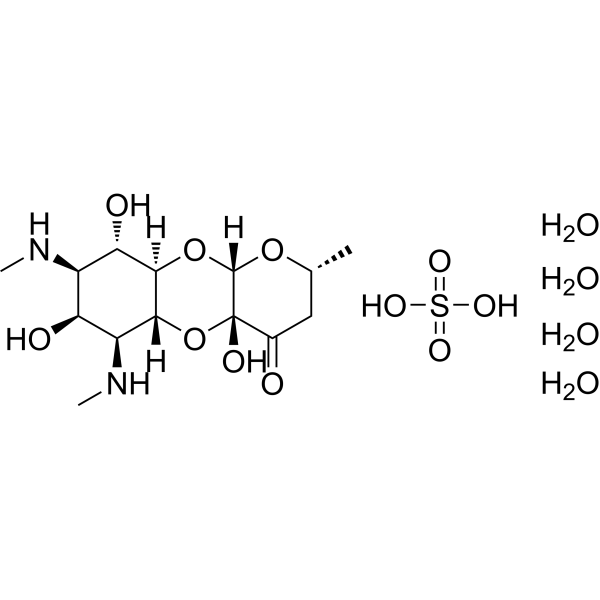 硫酸水合物壮观霉素选择性抑制细胞和大肠杆菌提取物中的蛋白质合成。硫酸水合物壮观霉素 (50 μg/mL) 可迅速可逆地抑制大肠杆菌生长并立即抑制氨基酸掺入 [1]。硫酸水合物壮观霉素 (1 μg/mL 或 3 μM) 抑制内源性信使 RNA 或 MS-2 噬菌体 RNA 指导的肽合成,在大肠杆菌提取物中最大抑制率为 70-80% [1]。硫酸水合物壮观霉素通过抑制结合来阻止肽基 tRNA 从延伸因子 G 的 A 位易位到核糖体的 P 位 [2]。硫酸水合物壮观霉素与 16S rRNA 中的残基 G1064 和 01192 特异性相互作用,并可能使其失活 [2]。硫酸壮观霉素水合物表现出依赖于 pH 变化和 Mg2+ 浓度的剪接抑制作用,表明与内含子 RNA 存在静电相互作用 [3]。